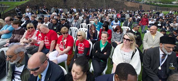 The event also saw the launch of a fleet of 100 special London buses with the Diamond Jubilee logo and the Ahmadiyya Muslim motto ‘Love for All, Hatred for None’.