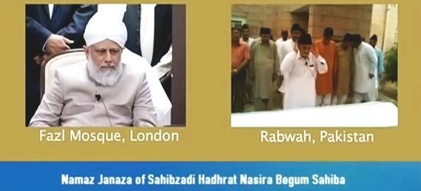 Hadhrat Mirza Masroor Ahmad Khalifatul Masih V joined the live broadcast from Fazal Mosque London to observe the funeral services which were being held in Rabwah, Pakistan.