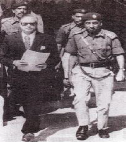 Masood Mahmood coming out of Court after giving evidence against Z.A BhuttoShortly after this happened, General Zia Ul Haq took over took the government and martial law was imposed in Pakistan. He took several head FSF members to court and prosecuted them for the murder of various politicians. Although Masood Mahmood was a good friend of Z.A Bhutto, he decided to help General Zia Ul Haq. He also had a secret deal with army generals to testify against Z.A Bhutto, a deal also pushed by the Americans who also wanted to get rid of Bhutto, who they considered a great threat. Z.A Bhutto was sentenced to death and the FSF dissolved. After Bhutto’s execution Masood Mahmood was granted an immigrant visa to the US and given a handsome cash settlement. (See article on the right about Masood Mahmood giving evidence.
