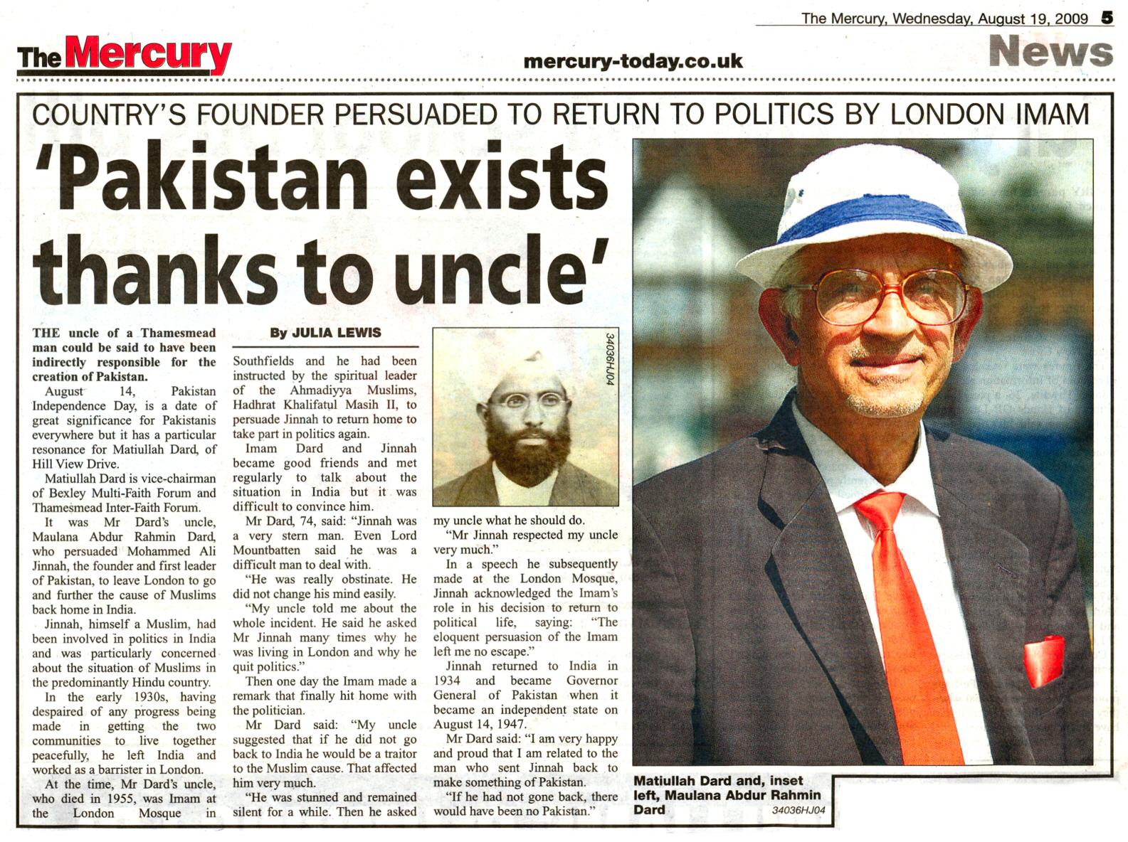 At the time, Mr Dard’s uncle, who died in 1955, was Imam at the London Mosque in Southfields and he had been instructed by the spiritual leader of the Ahmadiyya Muslims, Hadhrat Khalifatul Masih II Mirza Bashiruddin Mahmud, to persuade Jinnah to return home to take part in politics again.