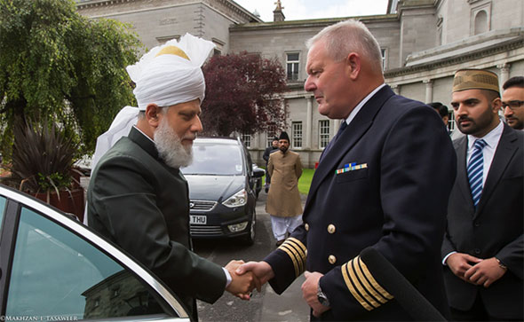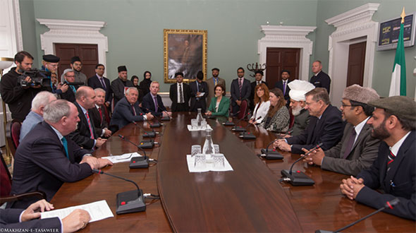 On 24 September 2014, the World Head of the Ahmadiyya Muslim Community, the Fifth Khalifa, His Holiness, Hazrat Mirza Masroor Ahmad visited the National Parliament of Ireland, the ‘Oireachtas’ at Leinster House in Dublin.