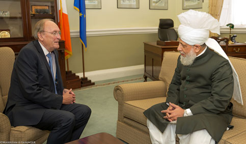 During a 30-minute meeting, the Speaker welcomed His Holiness to Ireland and spoke of his admiration of the peaceful message and positive contribution of the Ahmadiyya Muslim Community to Ireland. They also discussed the current world situation and various other matters.