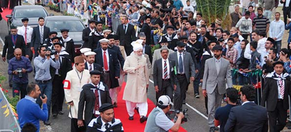 His Holiness waved at the Ahmadi Muslims as they raised Islamic slogans and recited poems in celebration at his arrival.