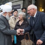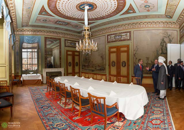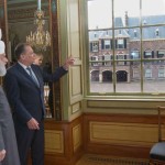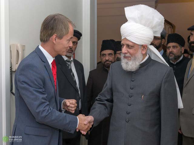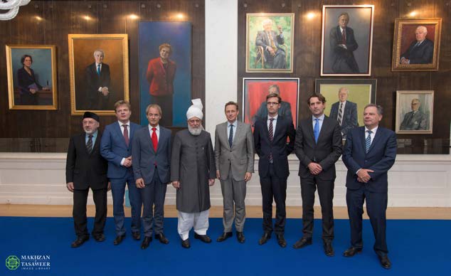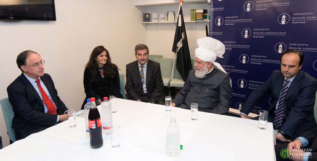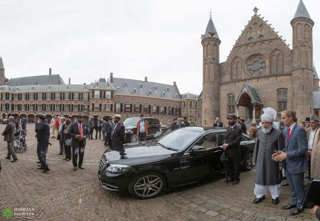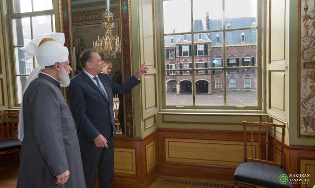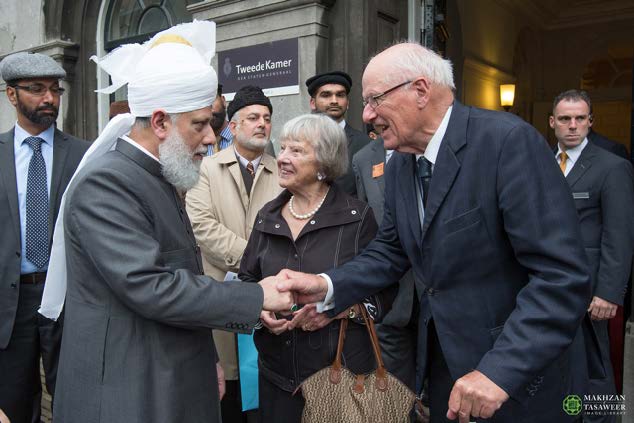 Upon arrival at the Parliament, Hazrat Mirza Masroor Ahmad was greeted by Harry van Bommel (Member of the House of Representatives and Deputy Chairman of the Standing Committee for Foreign Affairs), who escorted His Holiness to the Committee Room.