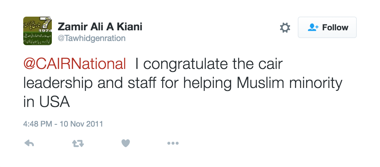 In November 2015 he met with CAIR director Nihad Awad and Congressman Don Beyer at the Dar al Hijrah Mosque in Virginia.