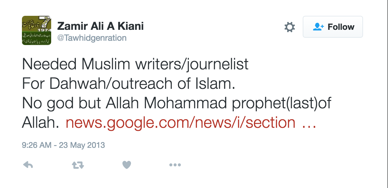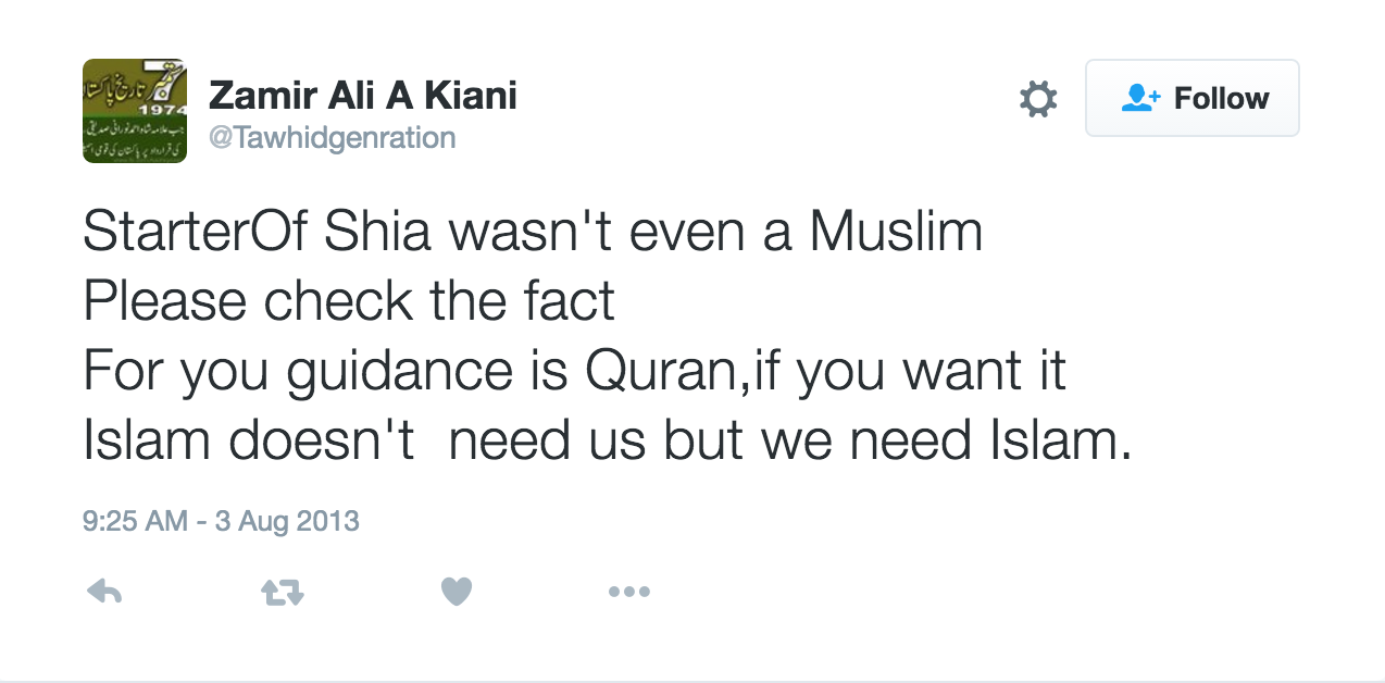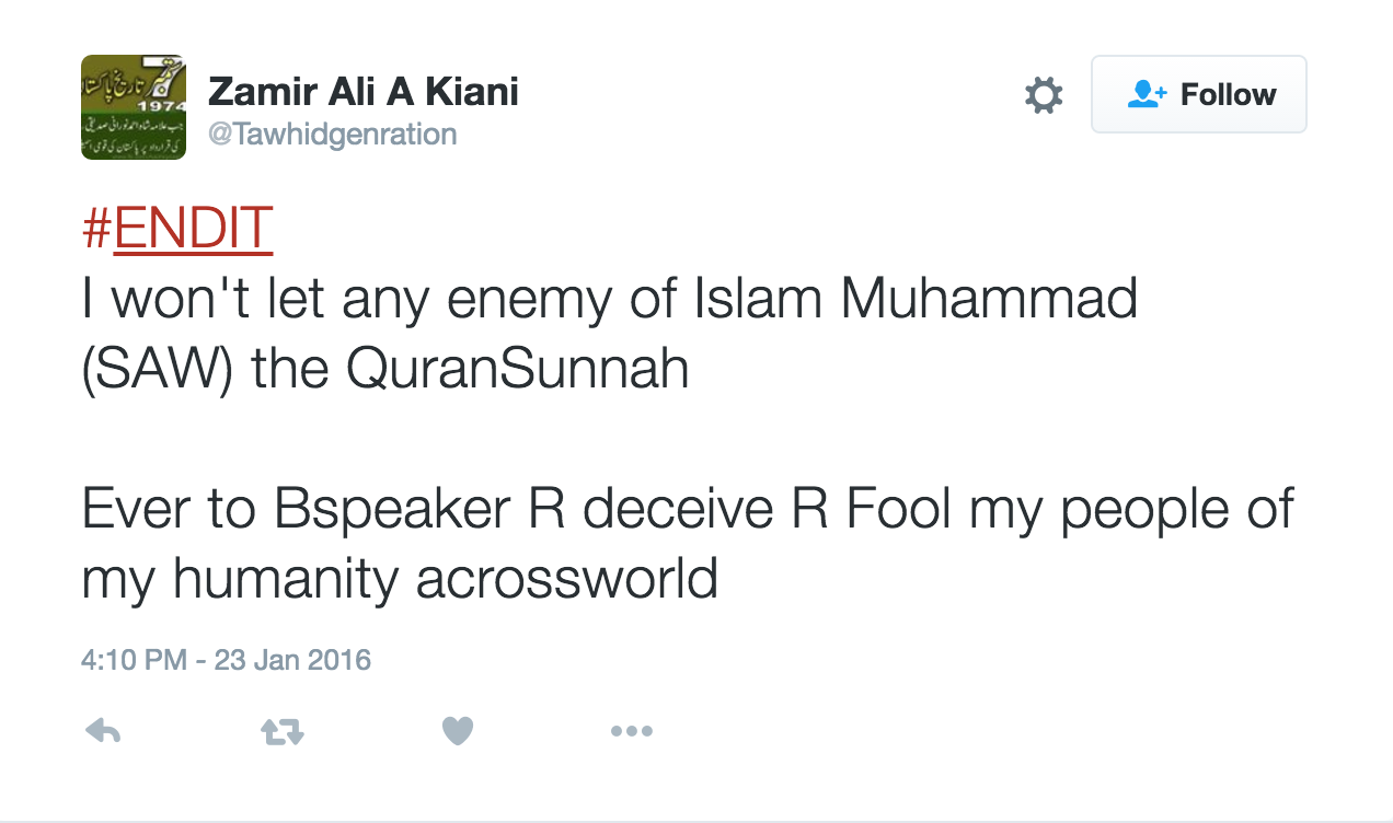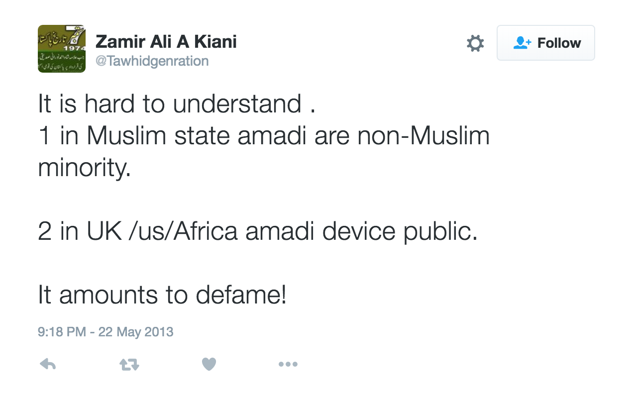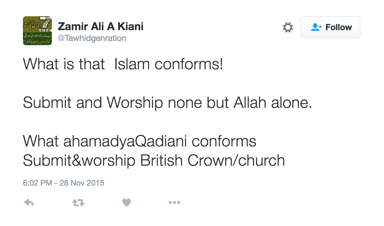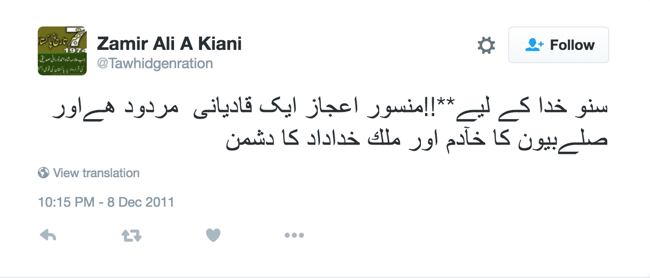 Kiani’s Twitter followers include Pakistan’s PTI (Pakistan Tehreek-e-Insaf), a political party known to have a soft side for the Taliban and whose leader Imran Khan has spoken out against Pakistan’s Ahmadis.