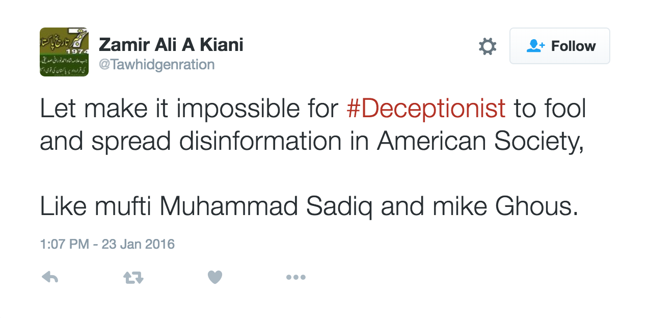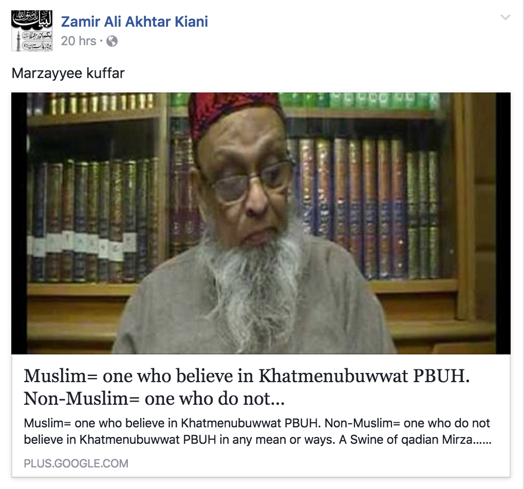 Kiani’s social media is not only filled with praise for the clerics and the killer but also loaded with continuous threatening messages against the more moderate Ahmadiyya branch of Islam. Ahmadiyya is one of the oldest and most peaceful Muslim communities in the U.S.