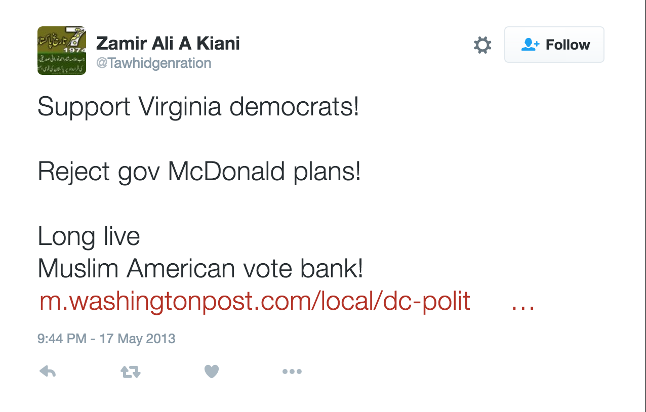 Zamir Ali Akhtar Kiani who resides in the Fairfax area is a regular at the infamous Dar al-Hijrah Mosque. It is the same Mosque where Al-Qaeda cleric Anwar Awlaki, served as an Imam (Preacher) from 2000 to 2002. Awlaki is known to have counseled at least two of the 9/11 hijackers. On two separate occasions, Kiani spoke to HiSpan TV in support of the Dar Al-Hijrah Mosque, Once in 2014 and then again in 2015.