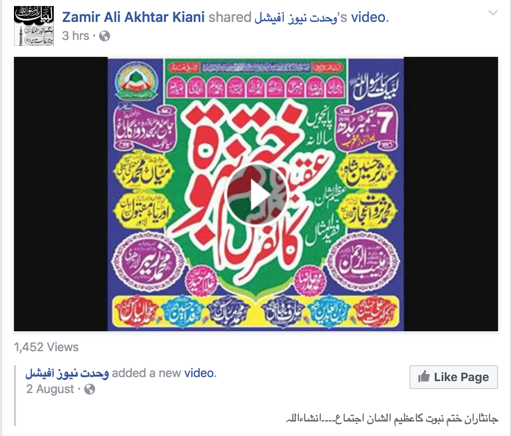 Kiani’s Facebook profile is filled with posts in praise of Qadri and his mentor Cleric Khadim Hussain Rizvi, who is the founder of “Tehrike Labbaik Ya Rasolollah” movement. In January the cleric and the movement’s leaders were charged under Pakistan’s anti-Terrorism act for organizing a rally in support of killer Mumtaz Qadri.