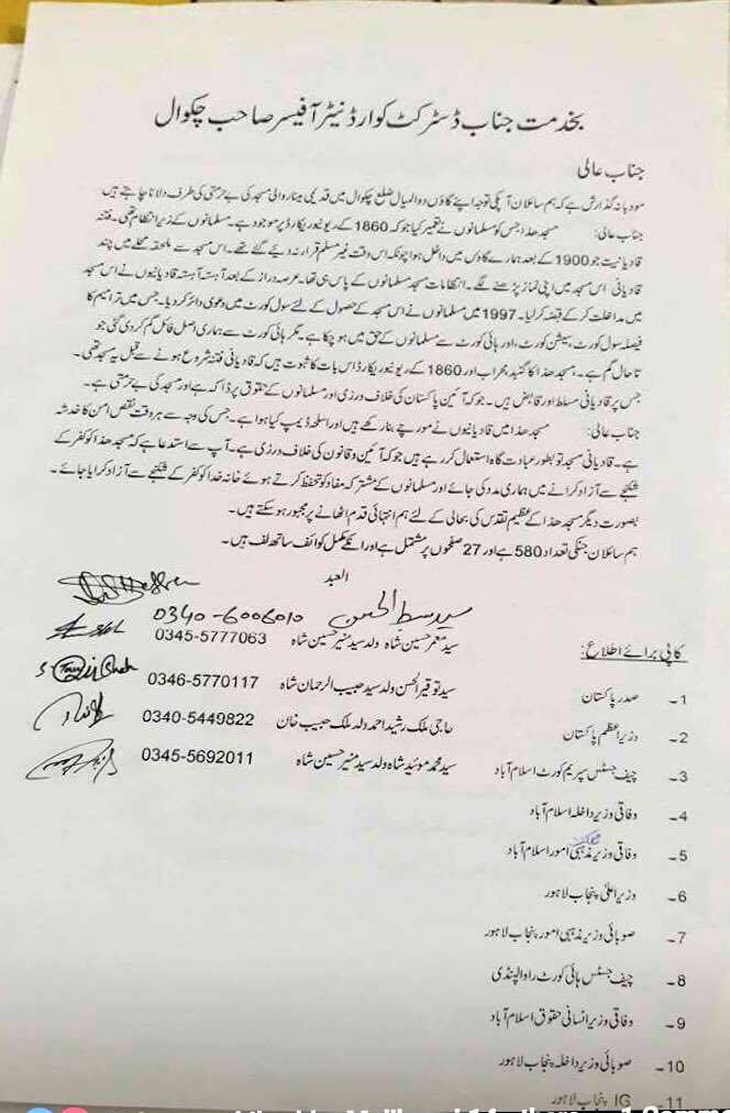 “The Qadianis (Ahmadis) are using the Mosque as their worship place which is illegal under the law, We request that you free the Mosque from the Infidels and save Muslim interests by saving the Mosque from these Infidels, If these steps are not taken we will be forced to take extreme measures in order to liberate this Mosque”
