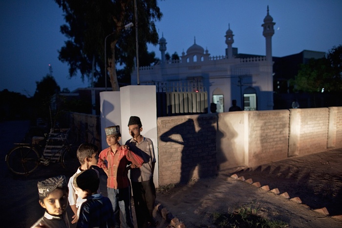 Members of the persecuted Ahmadiyya community gather after evening prayers outside a mosque on July 14, 2010 in Rabwah, Pakistan.