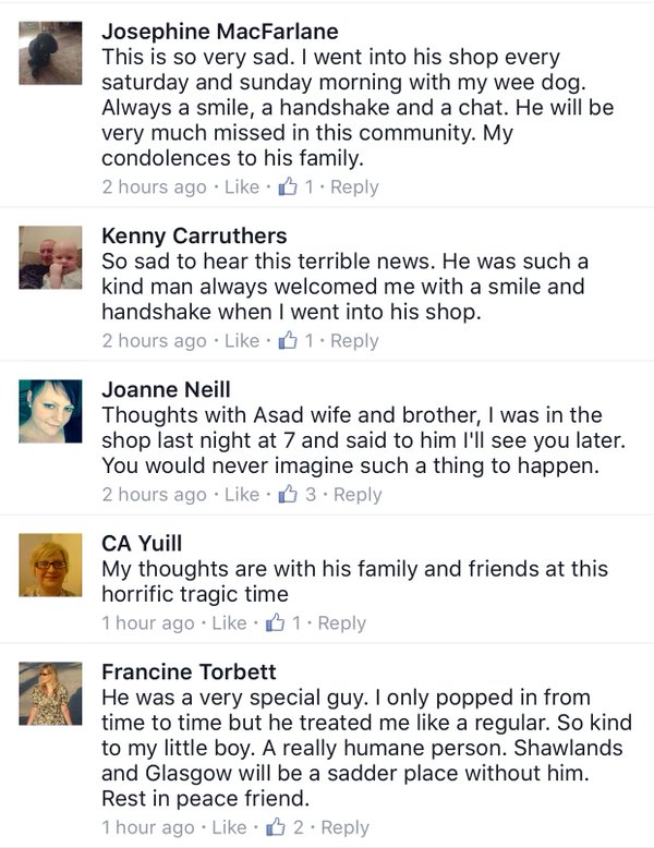 Shah’s family moved to Glasgow in the late 1990s and opened the shop in the Shawlands area of Glasgow. He believed in the minority Ahmadiyya sect of Islam and was originally from the Pakistani city of Rabwah, which is the center of Ahmadiyya Muslim Community in Pakistan. Only hours before his death on Thursday night Asad Shah had wished Christians a happy Easter in a Facebook post, and he had previously appeared to speak out against violence.