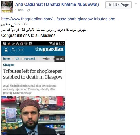 KhatmeNabuwat, an anti-Ahmadi group which is active in Ahmadiyya persecution in Pakistan, also has offices in London from where the group organises conferences that spread hate-speech against the Ahmadis in Britain; a popular Facebook group linked to the Pakistani branch of KhatmeNabuwat sent out a message of “congratulations” on news of Shah’s death.