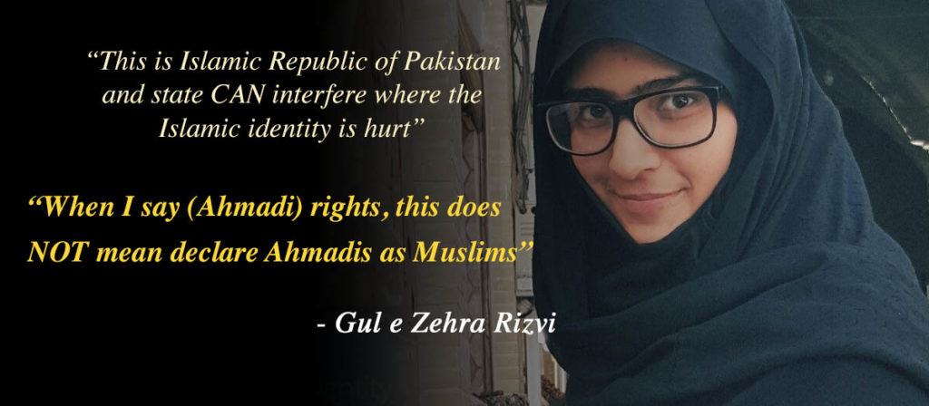 In her facebook post from June, she claimed that actor Hamza Ali Abbasi was a ‘pervert’ for speaking up for Ahmadi rights on TV. Pakistani law declares Ahmadis as infidels and prevents them from performing their religious duties in an Islamic way. The law is almost identical to the claim made by Sunni extremists against Shias who want them declared Kafir (Infidel) by law just like the Ahmadis.